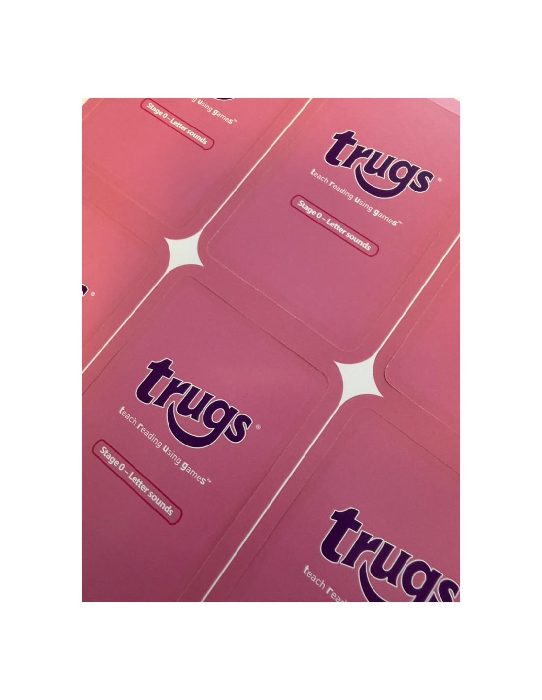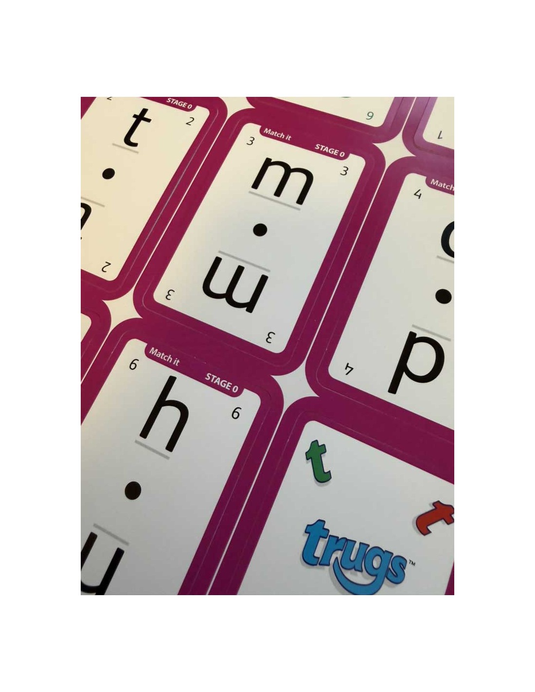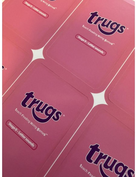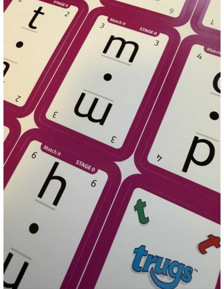 Trugs Stage 0 är utformad för att introducera hur bokstäver och ljud hänger ihop på engelska. Ordningsföljden är matchad med hur bokstäverna brukar läras ut i engelska skolor. Tre roliga kortspel används – Get it, Match it och Take it.